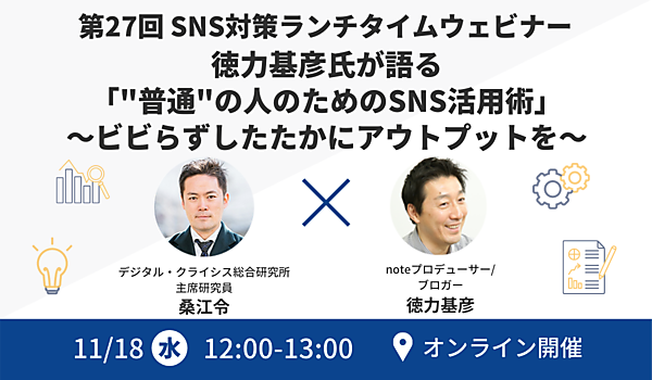 今回は「徳力基彦氏が語る『“普通”の人のためのSNS活用術~ビビらずしたたかにアウトプットを~』」をテーマに、組織で働く人がネットで自分をアピールする方法について解説いたします。組織で働く人は炎上や秘密漏洩を恐れて、ネット発信に及び腰になりがちです。しかしそうした「普通」の人ほど仕事上のメリットは大きいのです。トラブルを起こさない、懐疑的な上司を説得できる、本業に支障が出ない程度に気軽に続けられる、でも、着実に自分の名前で仕事がひろがっていく、そんな方法が、実はちゃんとあります。