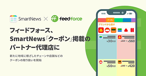 2020年11月16日、株式会社フィードフォース(所在地:東京都文京区、代表取締役:塚田 耕司、以下「フィードフォース」)はこの度、スマートニュース株式会社(東京都渋谷区、代表取締役:鈴木健氏)と連携し、同社が運用するニュースアプリ「SmartNews」へ、クライアント企業様のクーポン掲載を取り扱うパートナー代理店となりました。