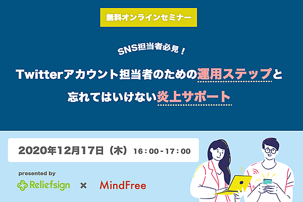 100社以上のSNS運用を手掛けてきたマインドフリーのソーシャルメディア事業部がお届けするオンラインセミナー第3弾!今回は、累計1,000社以上のSNS炎上対策支援を行ってきたリリーフサイン様と合同開催でTwitter運用におけるステップと炎上リスクについてお届けします。