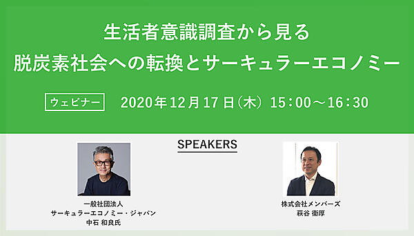 本セミナーでは、メンバーズが今年10月に実施した生活者の社会課題や気候変動に対する意識調査の結果報告と共に、日本におけるサーキュラーエコノミーの第一人者で一般社団法人サーキュラーエコノミー・ジャパン 代表理事の中石 和良氏をゲストスピーカーに迎え、サーキュラーエコノミーの基本的理解や海外企業の最新情報をお伝えします。