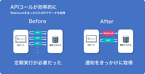 BカートのWebhook通知をきっかけにBカートのAPIを利用してデータを取得することが可能になります。これにより、APIによるデータ取得の定期実行を行わずに通知があった時だけデータ取得を行えるようになるので、基幹システムや販売管理システムとのAPI連携をより効率的に行うことができます。