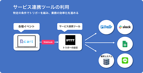 BカートのWebhookを利用するには、エンドポイントでデータを受信するシステムを構築する必要があります。または、Zapier(ザピアー)、Microsoft Power Automate、IFTTT(イフト)、Integromat(インテグロマット)などの※iPaaS(アイパース)ツールを介すことで連携できる場合もあります。これらのツールを利用することで、特定の条件に該当する場合のみ通知を行うトリガーの設定も可能となります。