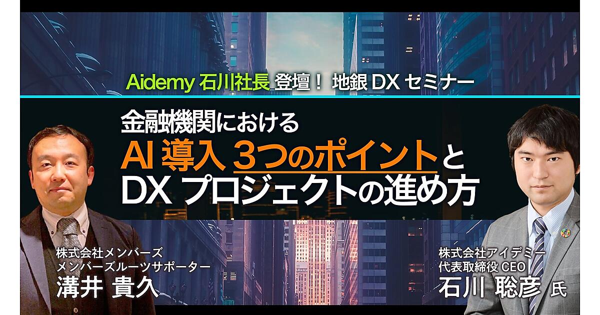尚、AIの内製化ソリューションAidemy Businessなどを提供し、金融機関含む各種業界のDX/AI活用の推進を支援している株式会社アイデミーとメガバンクを始め金融機関のデジタル支援に多くの実績を持つ株式会社メンバーズの地方銀行向け支援事業を手掛けるメンバーズルーツカンパニーの共催でお届けします。