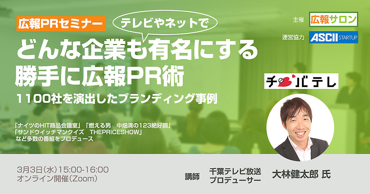 今回は、1100社以上の広報PRやブランディング、マーケティングに携わってきた現役のテレビプロデューサー大林健太郎さんをゲストに、普通の会社をどのように広報PR(演出)すれば、有名な企業になれるのか、売上が上がるのかについて伺います。