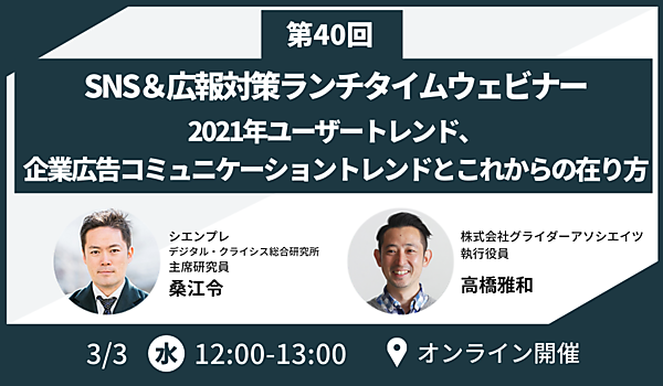 今回は、「2021年ユーザートレンド、企業広告コミュニケーショントレンドとこれからの在り方」をテーマに、2021年の企業広告コミュニケーショントレンドについて考察いたします。antenna* のデータを元にした最新のユーザートレンドの紹介や、最近話題になっている「音声SNSアプリケーションclubhouse」に関する解説などを行う予定です。