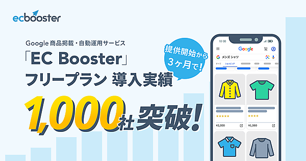 株式会社フィードフォース(所在地:東京都文京区、代表取締役:塚田 耕司、以下「フィードフォース」)が提供する Google 商品掲載・自動運用サービス「EC Booster」は、フリープラン提供開始3ヵ月で導入実績1,000社突破したことを発表いたします。