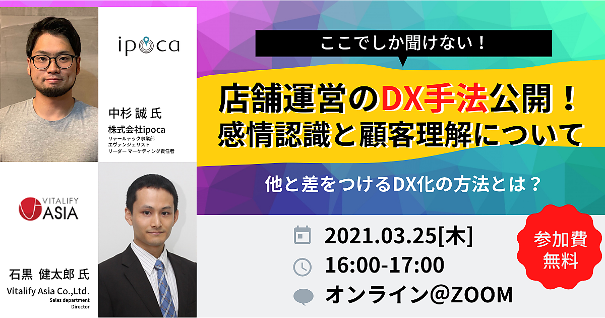 | 16:25~ | 第二部:他と差をつける小売DX 感情認識AIの活用法(Vitalify Asia Co.,Ltd.) 新しい生活様式が浸透した昨今、店舗におけるDX化を検討する方も増えてきたのではないでしょうか?第二部では他と差をつける小売DX感情認識AIの活用法と題し、店舗運営に顔感情の数値化AIシステム「MAL Visualize Emotion」を導入することによるDX化手法を大公開致します。DX化推進を検討の方必見の内容となっております! |