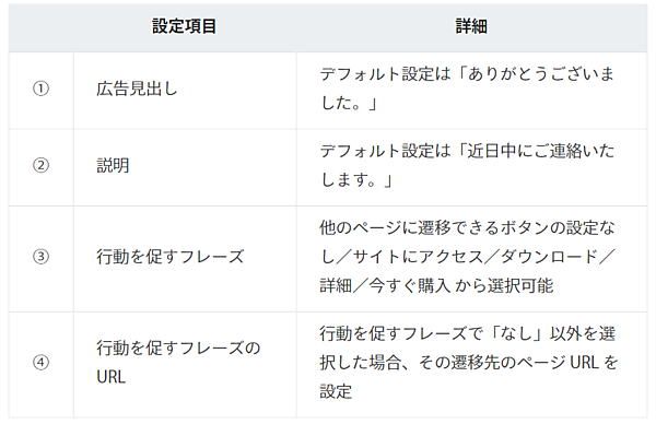 また、サイトの URL を設定すれば、フォーム送信後そのままサイトに流入する導線を作ることもできます。設定できる項目について下記にまとめました。