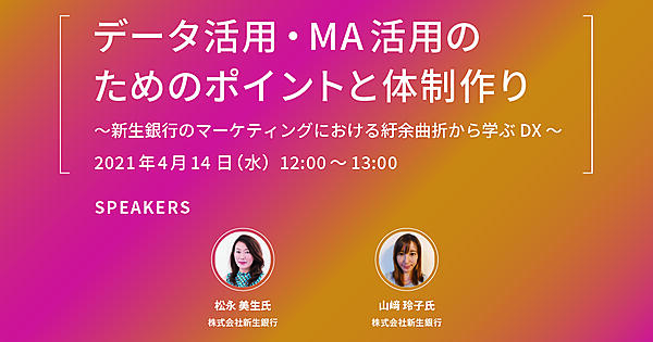 そこで今回は、積極的にデジタルマーケティングに取り組み、MA・データ活用を進めている新生銀行の松永さま・山﨑さまを迎え、実際にあったしくじり事例も交えながら成功するためのポイントをお話しいただきます。