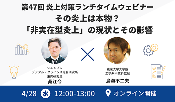 今回は、「その炎上は本物?『非実在型炎上』の現状とその影響」をテーマに解説いたします。“非実在型炎上”とは、文字通り「実在しない炎上」のことで、「少数の批判意見をメディアが大げさに炎上した」と報じることを意味します。昨今この”非実在型炎上”が増加傾向にありますが、その影響力や対策方法などについて、鳥海氏独自のデータ分析をもとにご説明いたします。