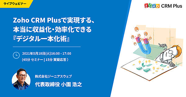 そこでこのウェビナーでは、Zoho CRM Plusで実現した、本当に効率的な『ビジネス活動のデジタル一本化術』をご紹介します。