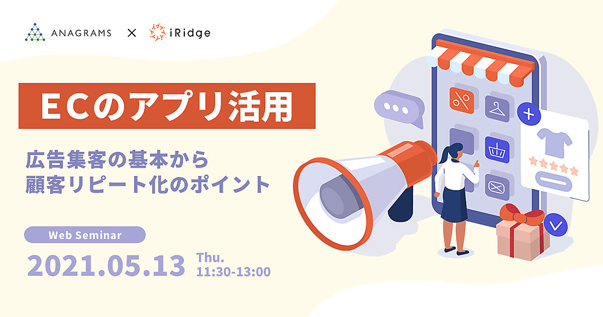 そこで本セミナーでは「ECのアプリ活用~広告集客の基本から顧客リピート化のポイント~」と題して、ECにおけるアプリインストール広告を活用した集客方法をアナグラムが、顧客リピート化のポイントをアイリッジが解説します。