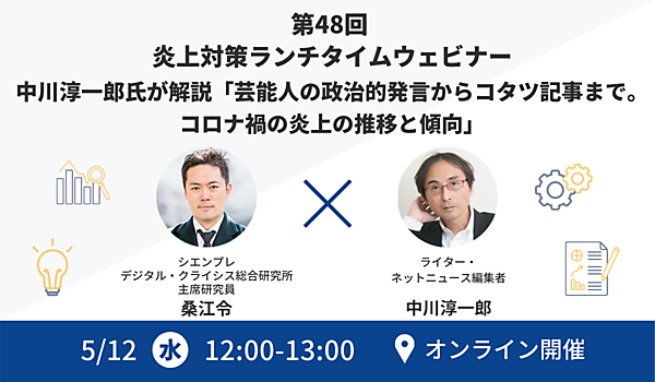 今回は、「中川淳一郎氏が解説『芸能人の政治的発言からコタツ記事まで。コロナ禍の炎上の推移と傾向」」をテーマに、分析・解説いたします。コロナ禍の炎上事案からコタツ記事による非実在型炎上まで、あらゆる炎上事案について多岐にわたり論じます。また、直近1年間の炎上事案やネット論調の総評を行います。