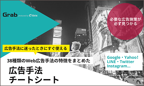 そこで今回はGrabを運営している総合広告代理店「株式会社アイビス」が取り扱っている主要な広告手法38種類を一覧にした「チートシート」を更新いたしました。