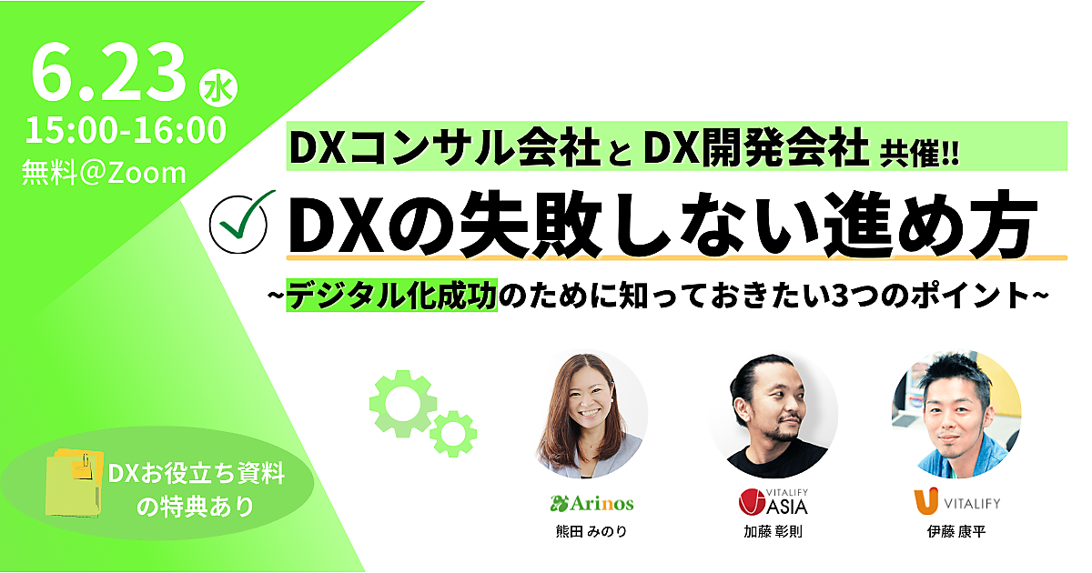 そこで今回、お客様の事業パートナーとしてビジネスモデル変革・DX推進・新規事業創出支援を行うArinosと、同じくお客様の事業パートナーとして次世代のDX支援開発サービスを提供するバイタリフィがタッグを組み2社共催ウェビナーを開催致します。