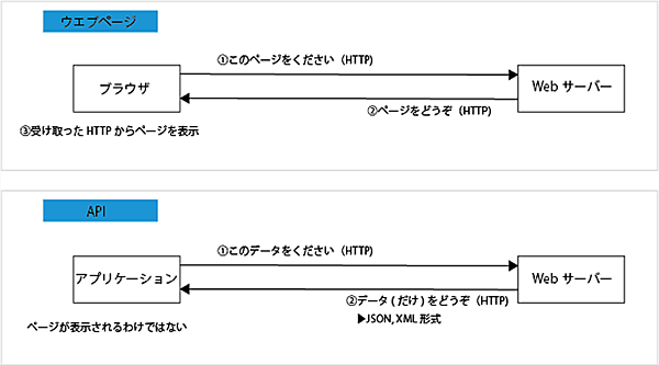 図1のように、人がウェブページを参照する時には、ブラウザのURLから、もしくは、ページ内のリンクをクリックすることでWebサーバーにHTTPリクエストが発行され、HTTPレスポンスとして人が解読可能なHTMLや画像・動画などのハイパーメディアをウェブページとして返します。同様に、アプリケーションからHTTPでリクエストを発行し、WebサーバーがHTTPでJSONもしくはXML形式でアプリケーションが解読可能なフォーマットでデータだけを返すことがWeb APIの仕組みです。
