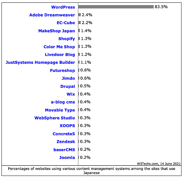 これまで TOP 3 しか掲載されていなかった Distribution of content management systems among websites that use Japanese (日本語を使用しているウェブサイトにおけるコンテンツマネジメントシステムの分布) について TOP 20 まで情報が掲載されました。
