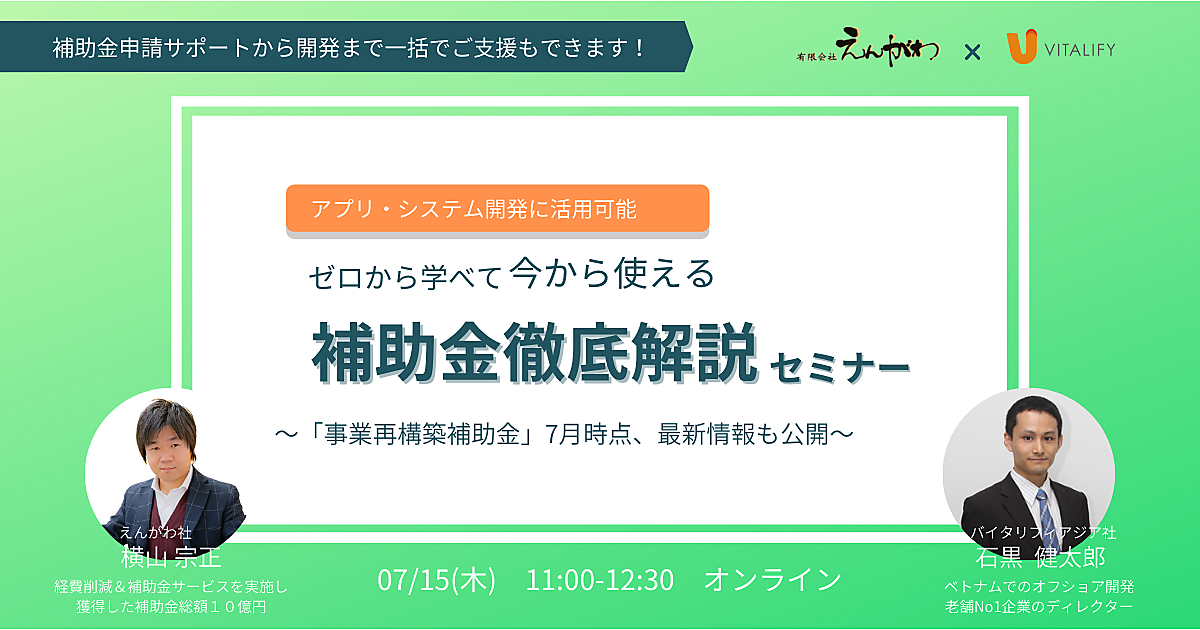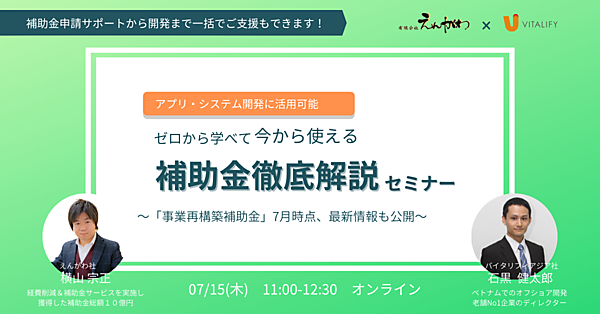 本セミナー主催のバイタリフィとえんがわ社が連携し、補助金の申請サポート~開発まで一括でご支援させていただくことも可能です。