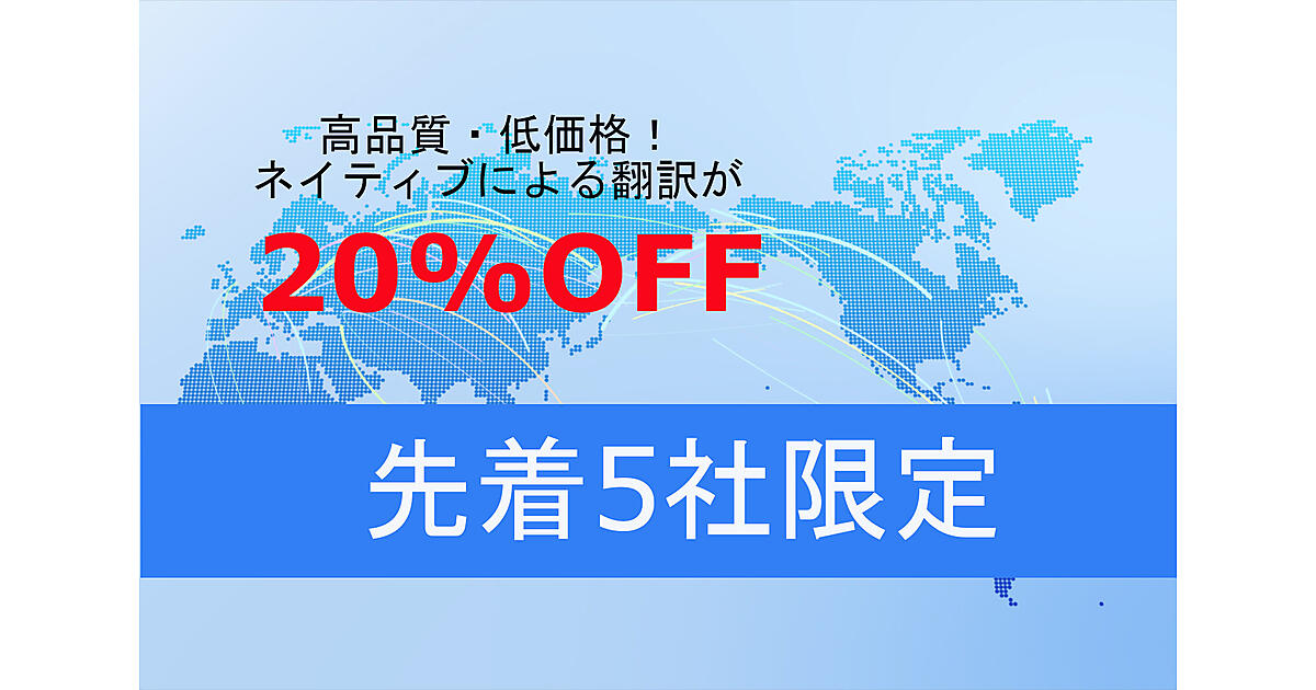 期間中、お申込みをいただいた先着5社様に限り、ネイティブによる翻訳サービスが、通常価格より20%OFFとなります。