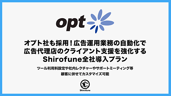 株式会社Shirofune(本社:東京都中央区、代表取締役 菊池満長、以下、Shirofune社)は、広告代理店のクライアント支援を強化するため、広告運用自動化ツール「Shirofune」(https://shirofune.com)の広告代理店向けプランの提供を開始しました。また、最初の導入企業として、国内有数のインターネット広告代理店である株式会社オプト(本社:東京都千代田区、代表取締役社長 CEO:栗本 聖也、以下、オプト社)へShirofune全社導入プランの提供を開始しました。