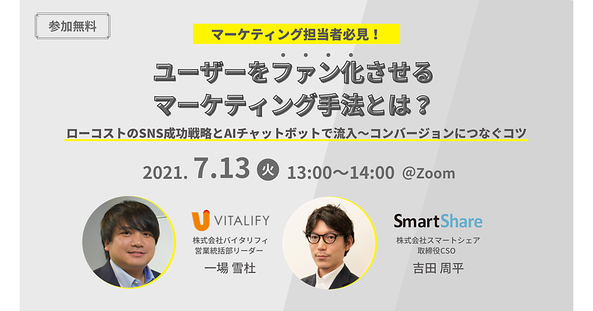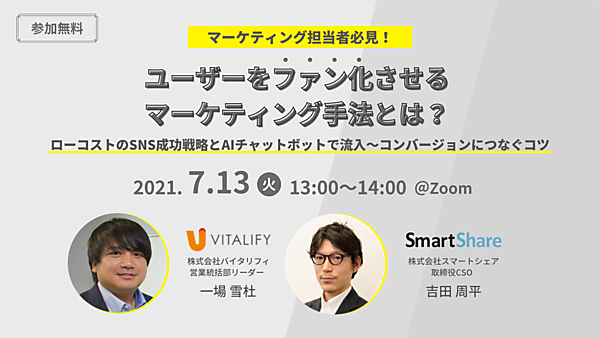 そこで今回はSNSマーケティングプラットフォーム「OWNLY」を提供するスマートシェアと、AIチャットボット「FirstContact」を提供するバイタリフィが共催で、流入~コンバージョンまでどのようなマーケティング施策を実施すべきなのか、そして、1度きりの購入ではなくリピートに繋げるためにユーザーをファン化させるには何が有効なのかを徹底解説します。