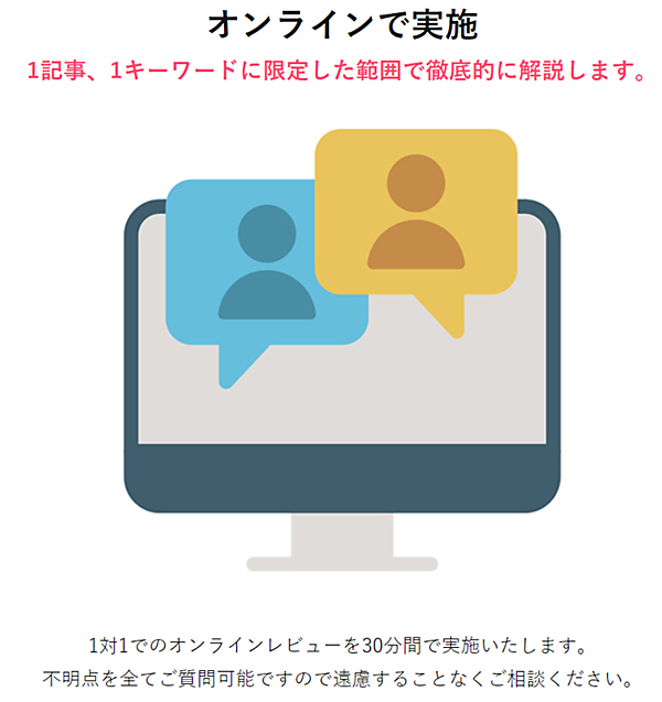 お申込みに際しては、上位表示を狙いたい対策KWを1KWまで指定し、そのKWを狙うためにこれまでに作成した記事のURLを提示していただきます。その際、コンサルタントがこれまでの記事の更新状況や、サイトの運営方針に関してのヒアリングを行いますのでご回答ください。