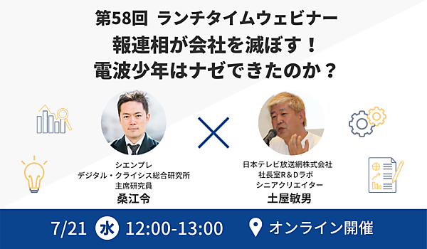 第59回となる今回は、『デジタル・クライシス白書-2021年7月度-』をテーマに、当研究員が直近1ヶ月の炎上事例やコロナ禍の動向について、解説・分析いたします。堅苦しくない内容を目指しますので、お昼のランチタイムにご飯を食べながら、仕事のちょっとした休憩がてらなど、お気軽にご視聴いただければと思います。途中までの参加、途中からの参加も可能です。在宅でも視聴可能ですので、ぜひ一度お気軽にご参加ください。
