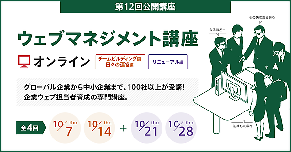 ※本講座はウェブ事業者様(制作会社、コンサルティング会社、広告代理店、SI会社、ウェブメディア媒体運営会社など)の参加はご遠慮いただいております。