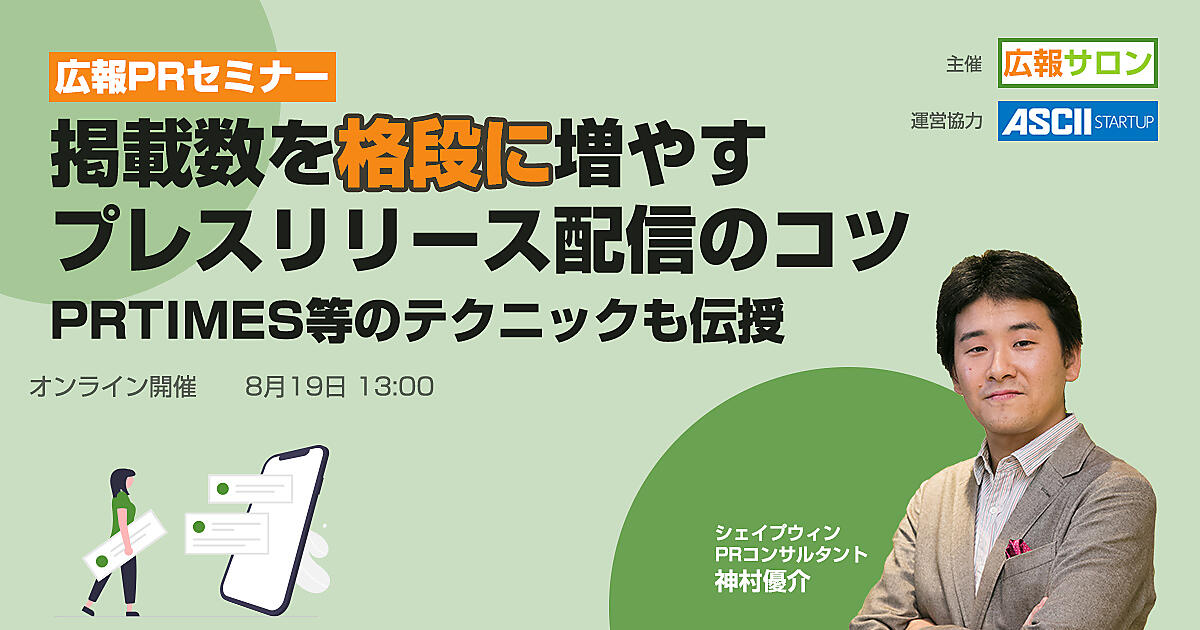 スタートアップから中堅・大手企業まで様々な業種の広報担当者のためのオンラインサロンです。専門家・先輩広報・メディアにSlack上で気軽に相談できるプラットフォームの提供をはじめ、広報担当者同士の交流、スキルアップに繋がるセミナーコンテンツの提供をしています。主宰:シェイプウィン株式会社、運営協力パートナー:ASCII STARTUP