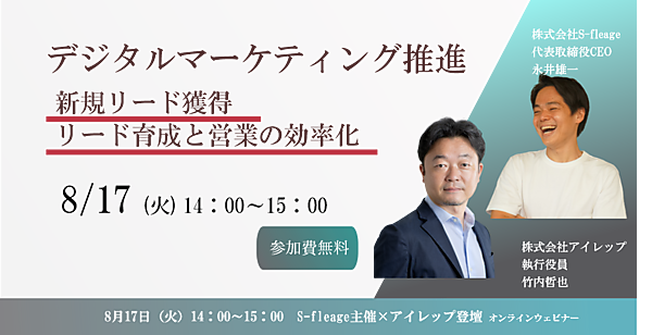 株式会社S-fleage(本社:京都市、代表取締役社長:永井雄一、以下S-fleage)は、Webマーケティング担当者様を対象に、「デジタルマーケティングで新規リード獲得、リード育成と育成後の営業の効率化ウェビナー」を、2021年8月17日(火)に開催いたします。S-fleageを主催として株式会社アイレップ執行役員竹内哲也氏よりウェビナーにて登壇頂きます。