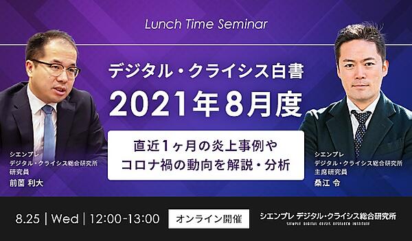 第63回となる今回は、『デジタル・クライシス白書-2021年8月度-』をテーマに、当研究員が直近1ヶ月の炎上事例やコロナ禍の動向について、解説・分析いたします。堅苦しくない内容を目指しますので、お昼のランチタイムにご飯を食べながら、仕事のちょっとした休憩がてらなど、お気軽にご視聴いただければと思います。途中までの参加、途中からの参加も可能です。在宅でも視聴可能ですので、ぜひ一度お気軽にご参加ください。