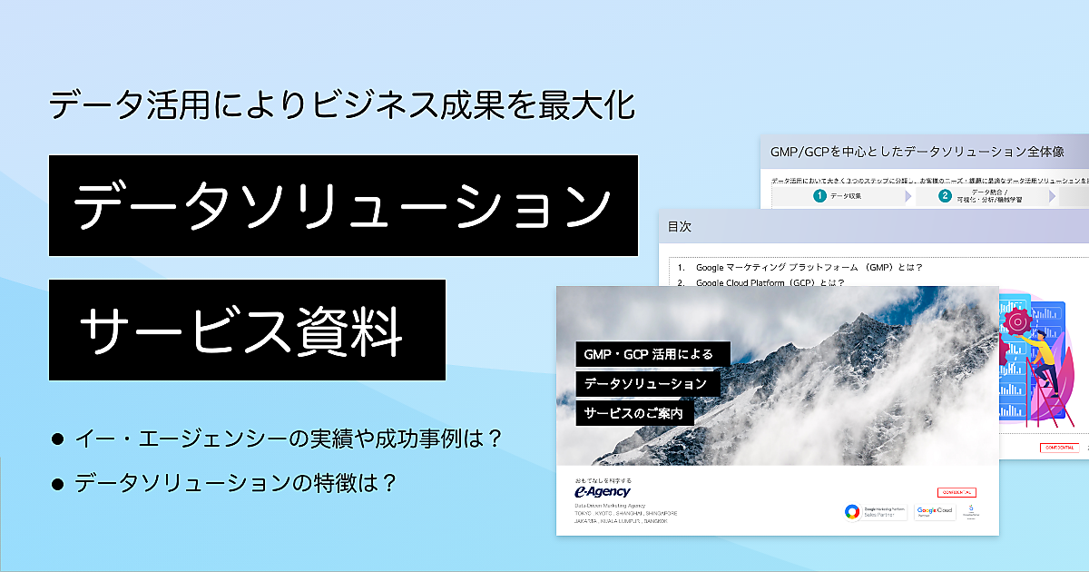 今回の資料では、Google アナリティクスをはじめとするGoogle マーケティング プラットフォーム(GMP)や、BigQueryをはじめとするGoogle Cloud Platform(GCP)などを活用したデータソリューションサービスについて、メニュー・内容やそのメリット、活用成功事例などを詳しくご紹介しております。