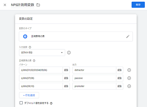 アンケートの実装ができたら、今度はそれをNPSとして計測するためのGTMでの設定です。変数はユーザー定義変数で新規に「正規表現の表」を設定します。