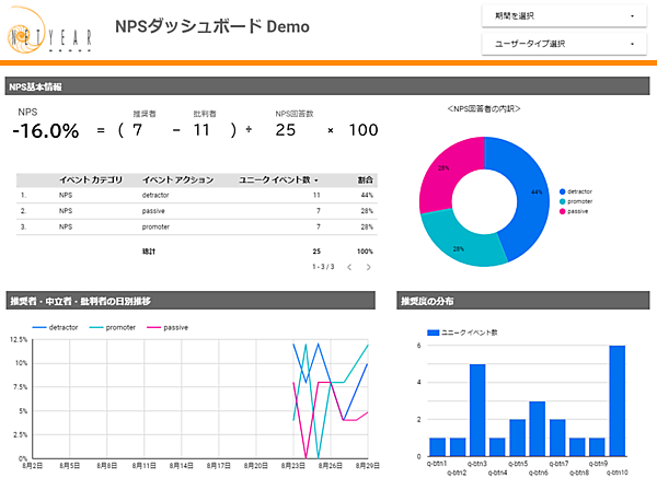 ダッシュボードの作成にあたって、推奨者・中立者・批判者のそれぞれを抽出するための「イベントアクション」、個別のスコアを抽出するための「イベントラベル」が使用できますので、それらを使って最適なレポートを作ることができます。