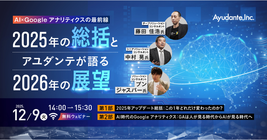 アユダンテが語る2026年の展望「AI×Google アナリティクスの最前線」12/9(火)オンライン開催 「AI×Google アナリティクスの最前線 ~2025年の総括とアユダンテが語る2026年の展望~」を12/9(火)14:00~15:30、オンラインにて開催する。