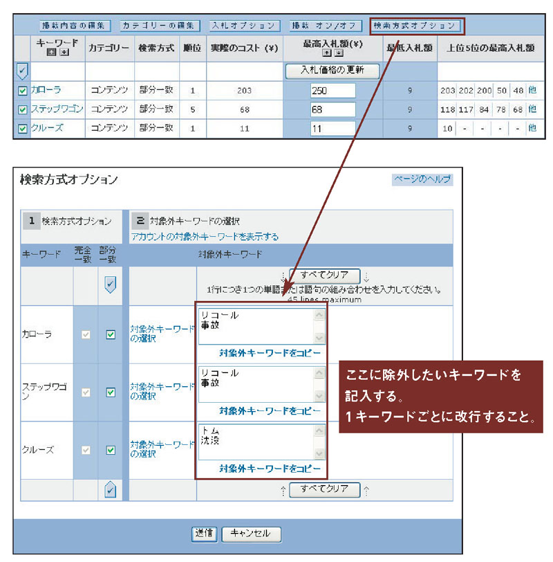 そのいっぽう、部分一致方式のために「カローラ リコール」や「ステップワゴン 改造」のような、リコール情報や改造車の情報を探している検索ユーザーにも広告が表示されてしまう。この場合、そもそもクリックされにくいだけでなく、もしクリックされてしまうと顧客化につながる見込みのない無駄クリックが発生して費用がかさんでしまう。