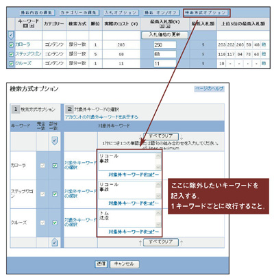 これらのケースの場合、対象外キーワードとして、中古車販売のサイトならば「リコール」や「改造」を、クルーズツアーのサイトならば「トム」をスポンサードサーチの管理画面で設定すれば、指定した対象外キーワードが含まれる検索に対しては広告が表示されなくなるため、顧客化に直結しない無駄なクリックを抑制できる。
