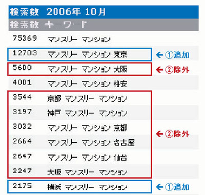 オーバーチュアのキーワードアドバイスツールによると、「マンスリーマンション」を含む検索キーワードで検索ボリュームの上位を占めるのは「マンスリーマンション 東京」「マンスリーマンション 大阪」という地名との組み合わせである(図2)。