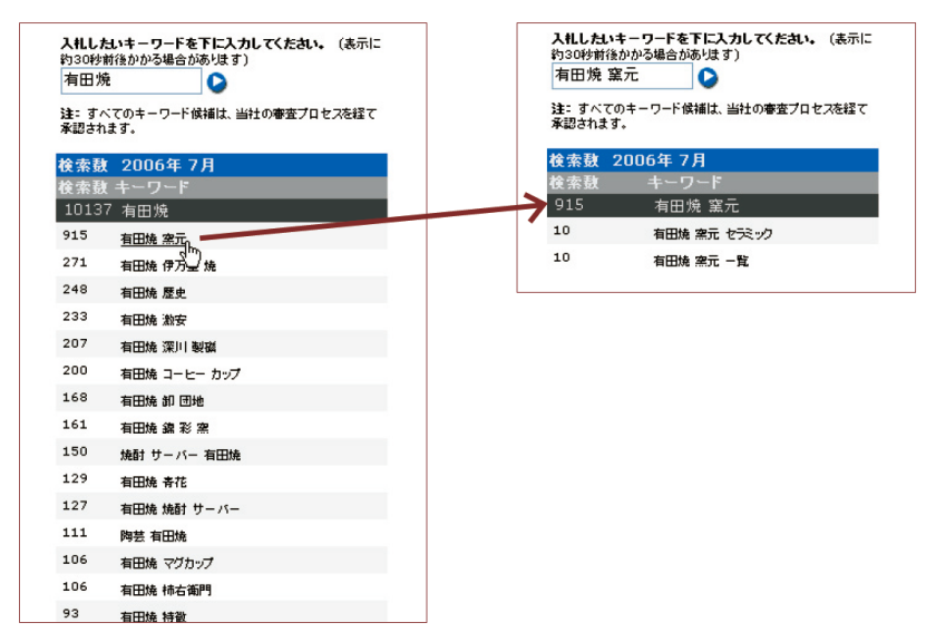 オーバーチュアが提供しているキーワード調べの基本ツールだ。調べたいキーワードを入力して右側の青い矢印をクリックすると、前月にオーバーチュアの提携パートナーサイトで実際に検索された関連キーワードが検索数の多い順に100位まで表示される。たとえば、「有田焼」を調べてみると、第2検索ワードとして「窯元」「販売」「通販」だけでなく、「激安」「アウトレット」など販売の価格特性や、「コーヒーカップ」「焼酎サーバー」などの商品名、「深川製磁」「錦彩窯」などのメーカーブランド名のような、ショップとして有効なキーワードが実際に検索されていることがわかる。
