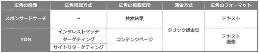 Yahoo!プロモーション広告には、検索結果に広告を表示する「スポンサードサーチ」と、コンテンツページに広告を表示する「Yahoo!ディスプレイアドネットワーク(YDN)」の2つのサービスがあります。YDNには、さらに訴求したい対象にあわせて選択できる複数の広告掲載方式があります。