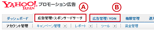 広告管理ツールには、「ダッシュボード」「広告管理:スポンサードサーチ」「広告管理:YDN」「権限管理」「運用サポートツール」の5つのタブがあります。クリック料金の入金や広告の入稿は、「広告管理:スポンサードサーチ」と「広告管理:YDN」でそれぞれ別々に行います。