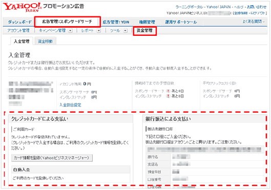 スポンサードサーチの入金情報は、「広告管理:スポンサードサーチ」タブの「資金管理」で確認できます。