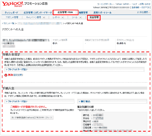 YDNの入金情報は、「広告管理:YDN」タブの「資金管理」タブで確認できます。スポンサードサーチのクリック料金とは別々に入金する必要がありますのでご注意ください。