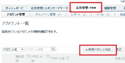 1. 広告管理ツールの「広告管理:YDN」タブで、画面右側の[+新規アカウント作成]ボタンを押す