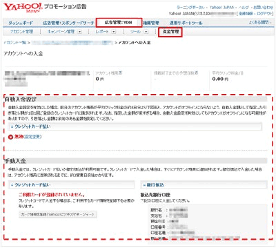 YDN用の広告料金は、スポンサードサーチの広告料金とは別に入金します。支払い方法はクレジットカードによる支払いと銀行振り込みによる支払いの2種類です。すぐに広告掲載を始めたい場合は、クレジットカードでの入金が便利です。