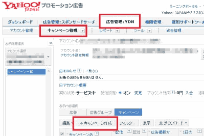 1. 「広告管理:YDN」タブ、「キャンペーン管理」タブの順にクリックし、キャンペーン管理画面中央にある[+キャンペーン作成]ボタンを押す