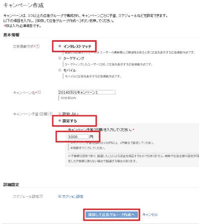 入力が終わったら、[保存して広告グループ作成へ]ボタンを押します。これでキャンペーンが完成しました。