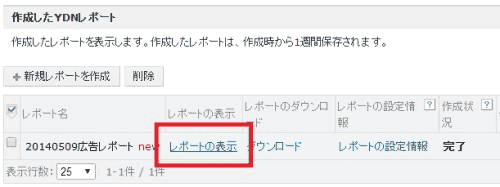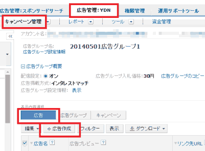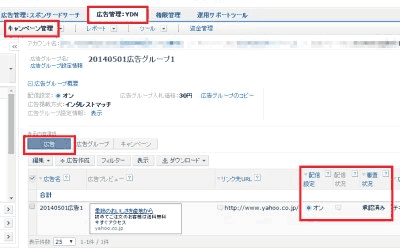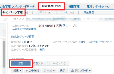 - 「広告管理:YDN」タブ、「キャンペーン管理」の順にクリックし、「表示内容選択」で「広告」ボタンを押す