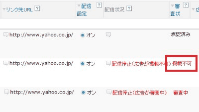 審査状況が「掲載不可」や「掲載停止」の場合は、広告掲載ガイドラインに沿って修正する必要があります。不明点はお客様サポートセンターにお問い合わせください。