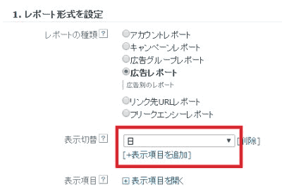3. 「表示切替」で[+表示項目を追加]をクリックし、プルダウンで「日」が選択されていることを確認して、「保存」ボタンを押す